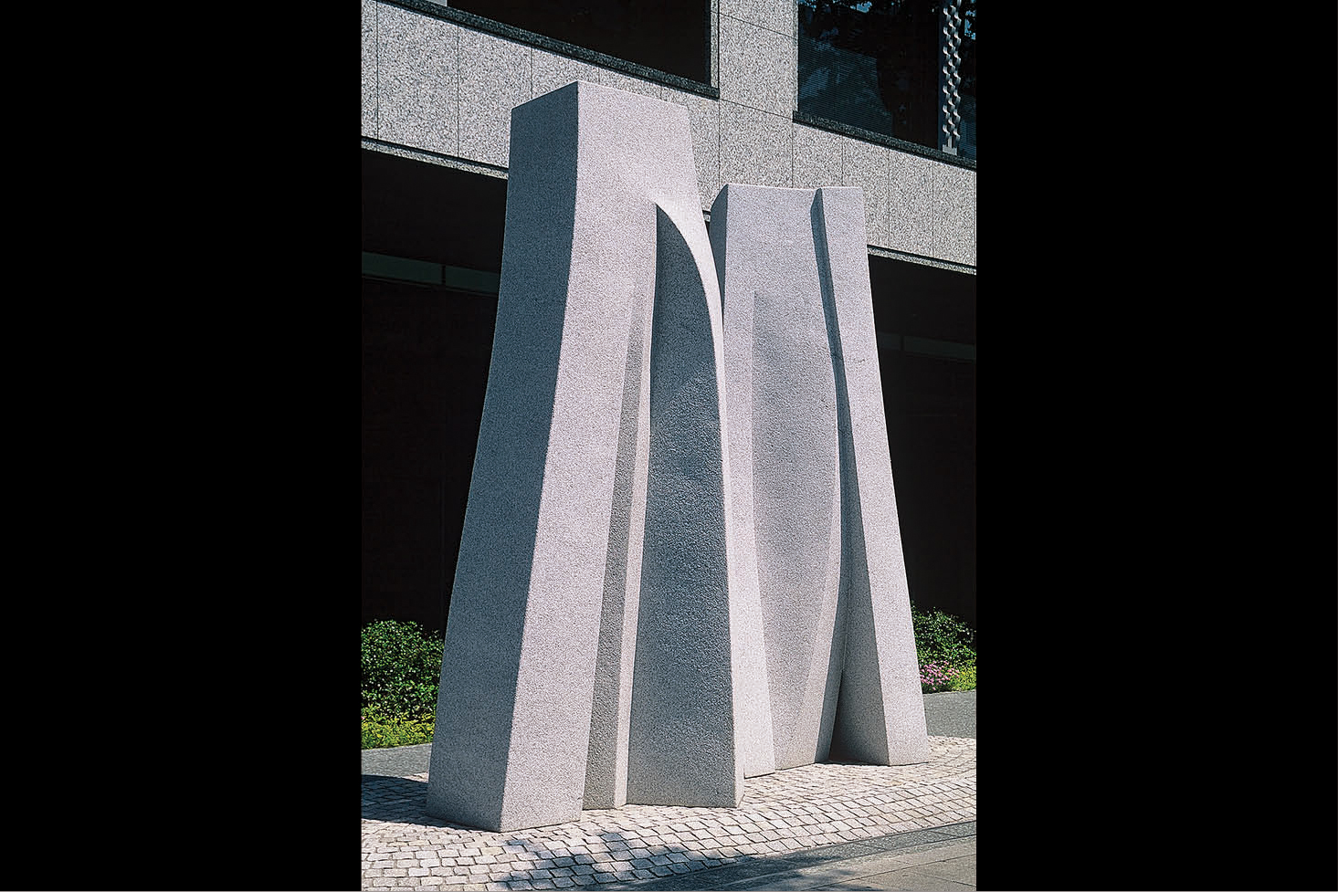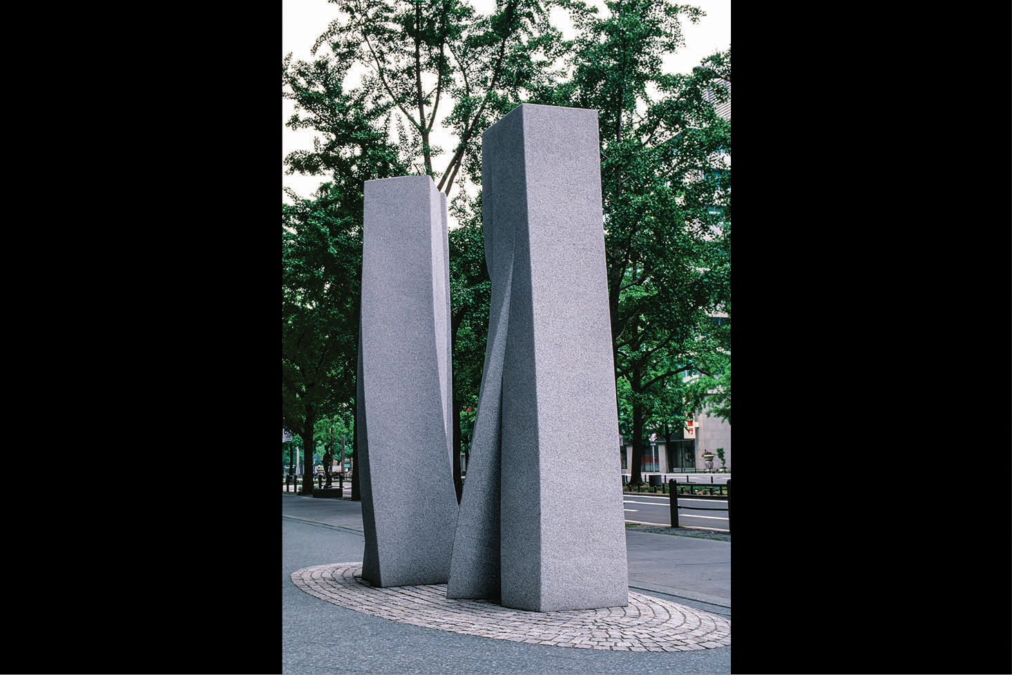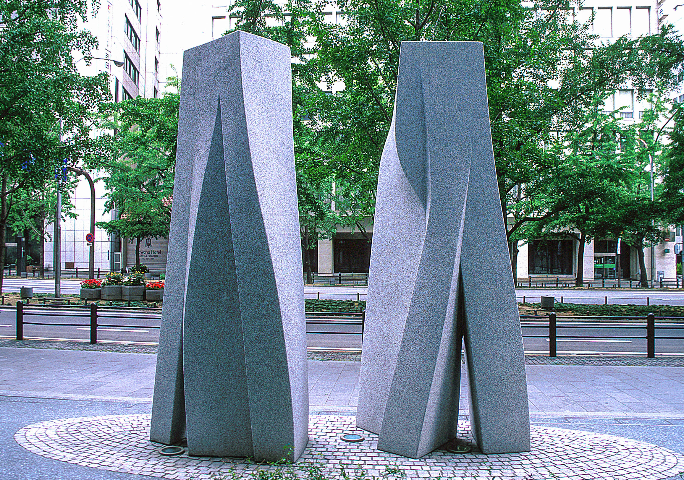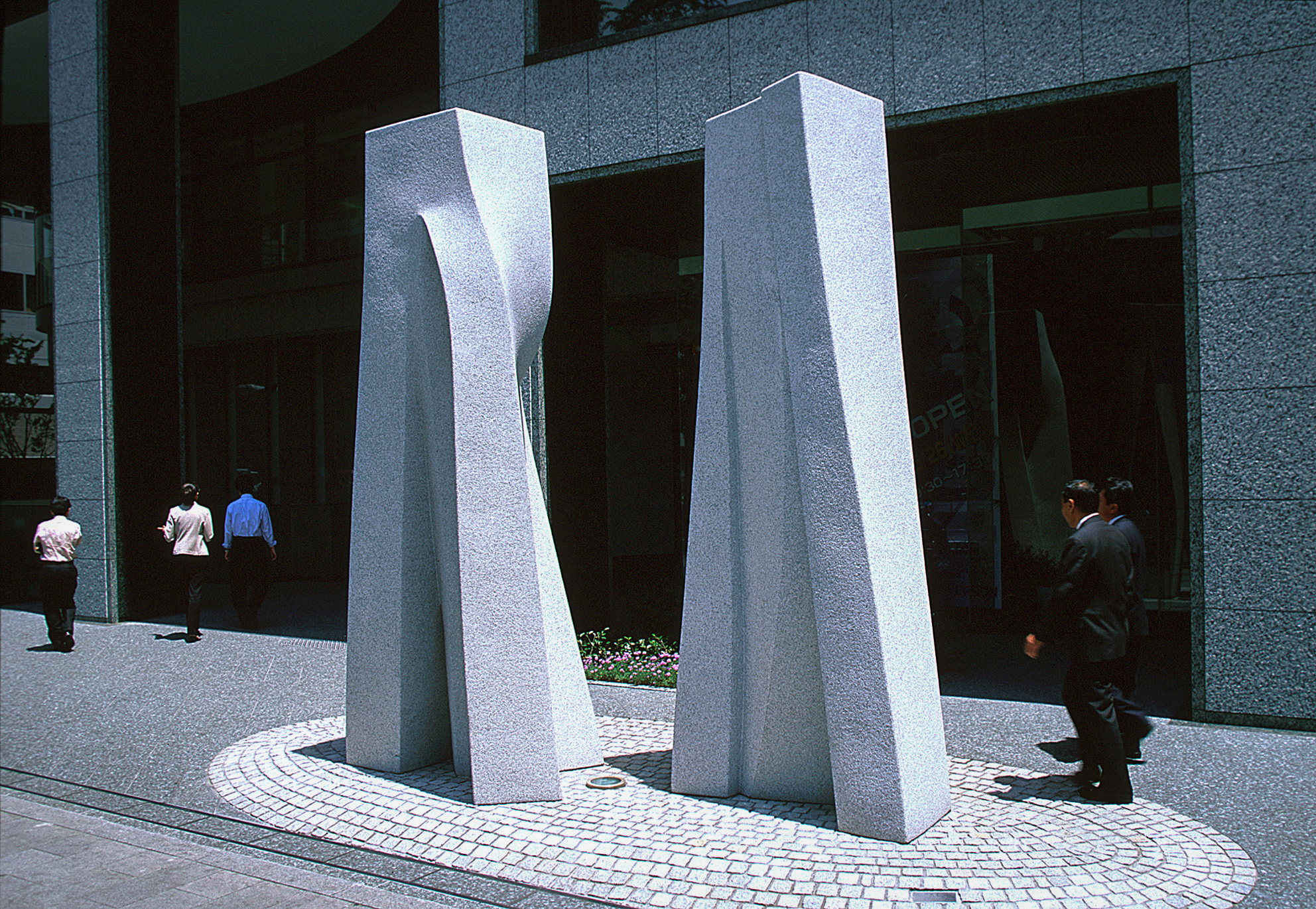 This sculpture is also intended to find completion in its setting, only this time the setting is that of a great city, Osaka. The installation is intended to be both in consonance with the surrounding buildings and in harmony with the flow of people and the passage of time. The neighbourhood, Midosuji, is a place of work, with people walking hurriedly by, sometimes casting the sculpture a glance. Ideally, at some point, one such person will perceive its beauty, as if struck by a strain of beautiful music. His heart swells and he smiles inadvertently at the other passers-by. At that joyous moment, Midosuji itself become a community.