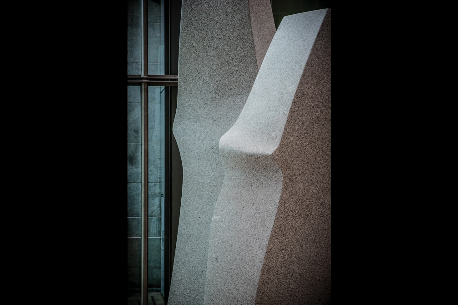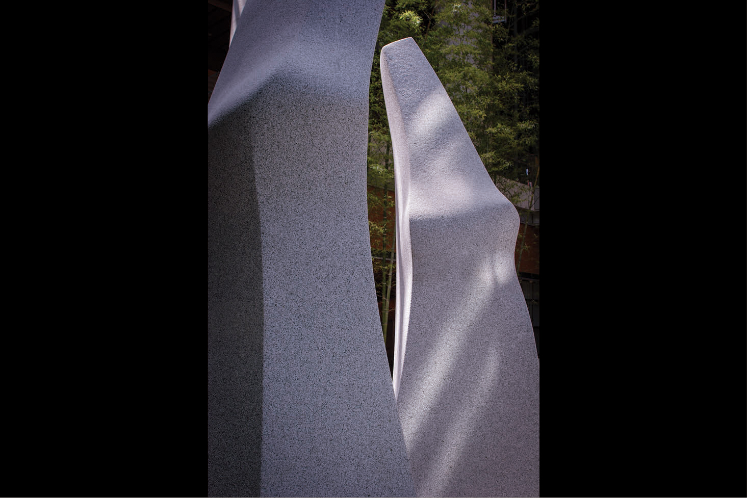 “Two granite figures surge into the air like two giant wings. The tall, slightly truncated triangles also suggest an intimate human encounter, a mutual awareness, in the manner in which they curve inward toward each other”