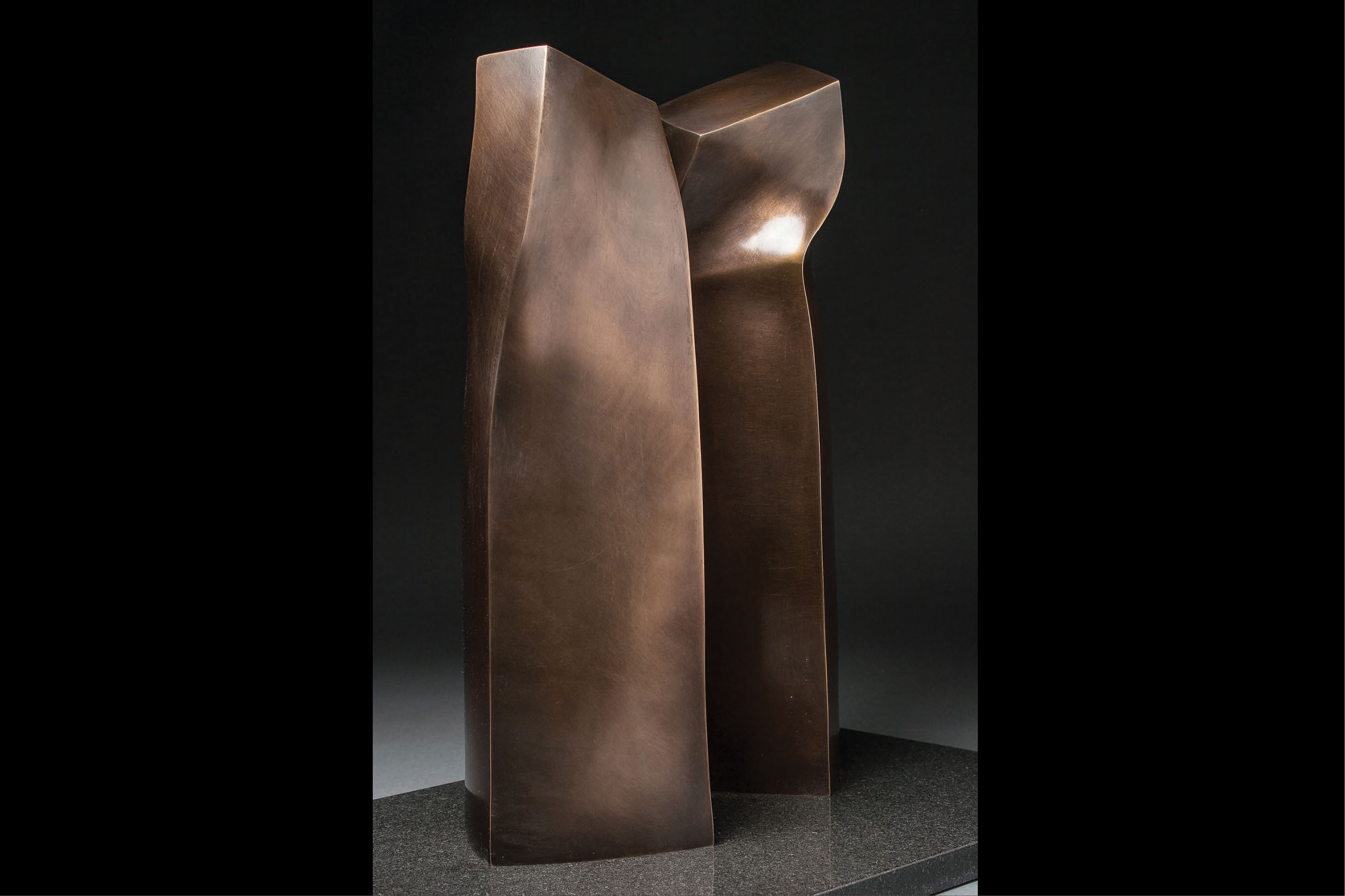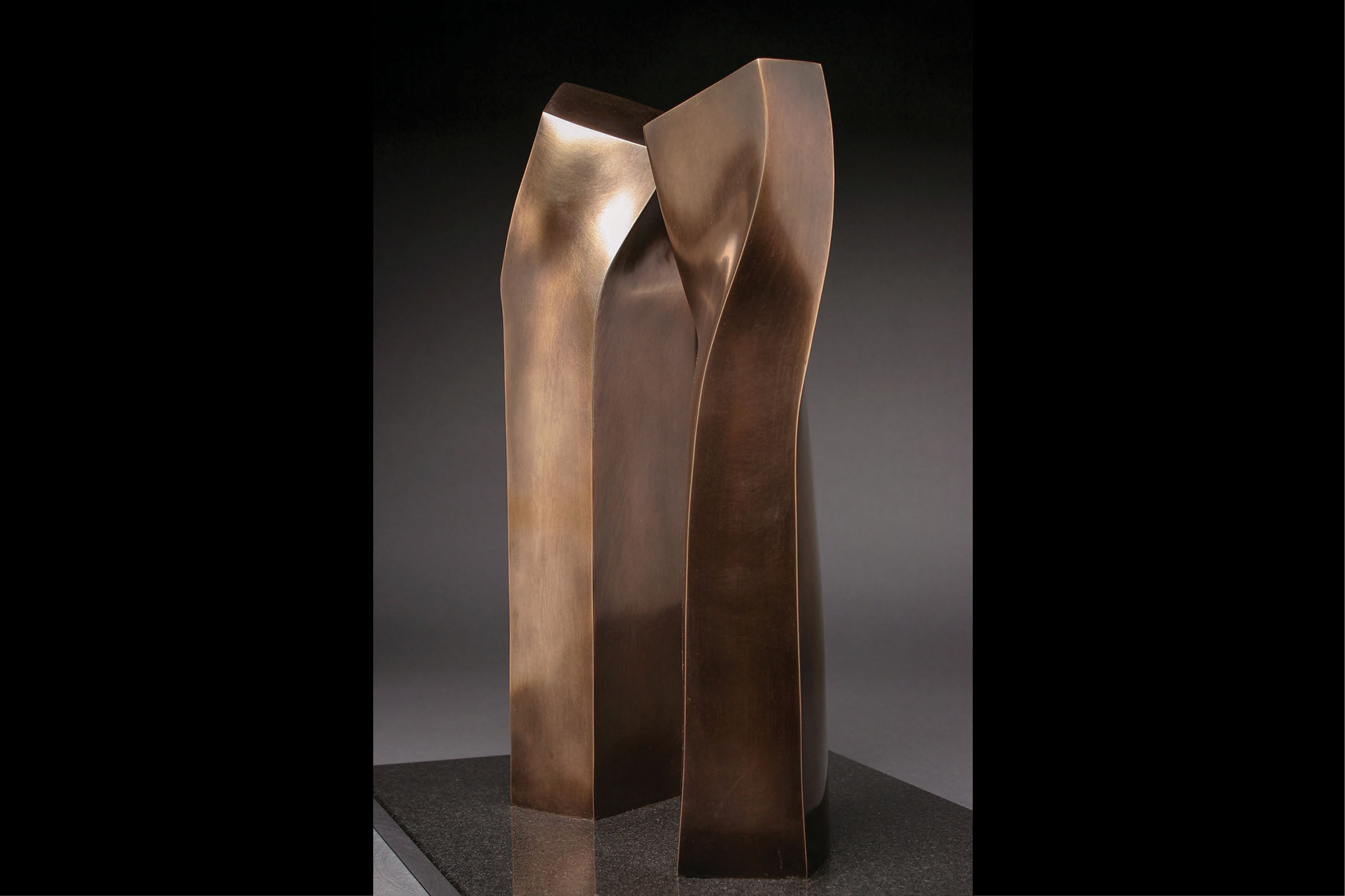 A study in lines, surfaces, movements. Two elegant columns complement each other. Observing the piece, you feel the space between them itself become a part of the sculpture, actively contributing to its subtle flowing movement. The columns and the space constitute a single piece.