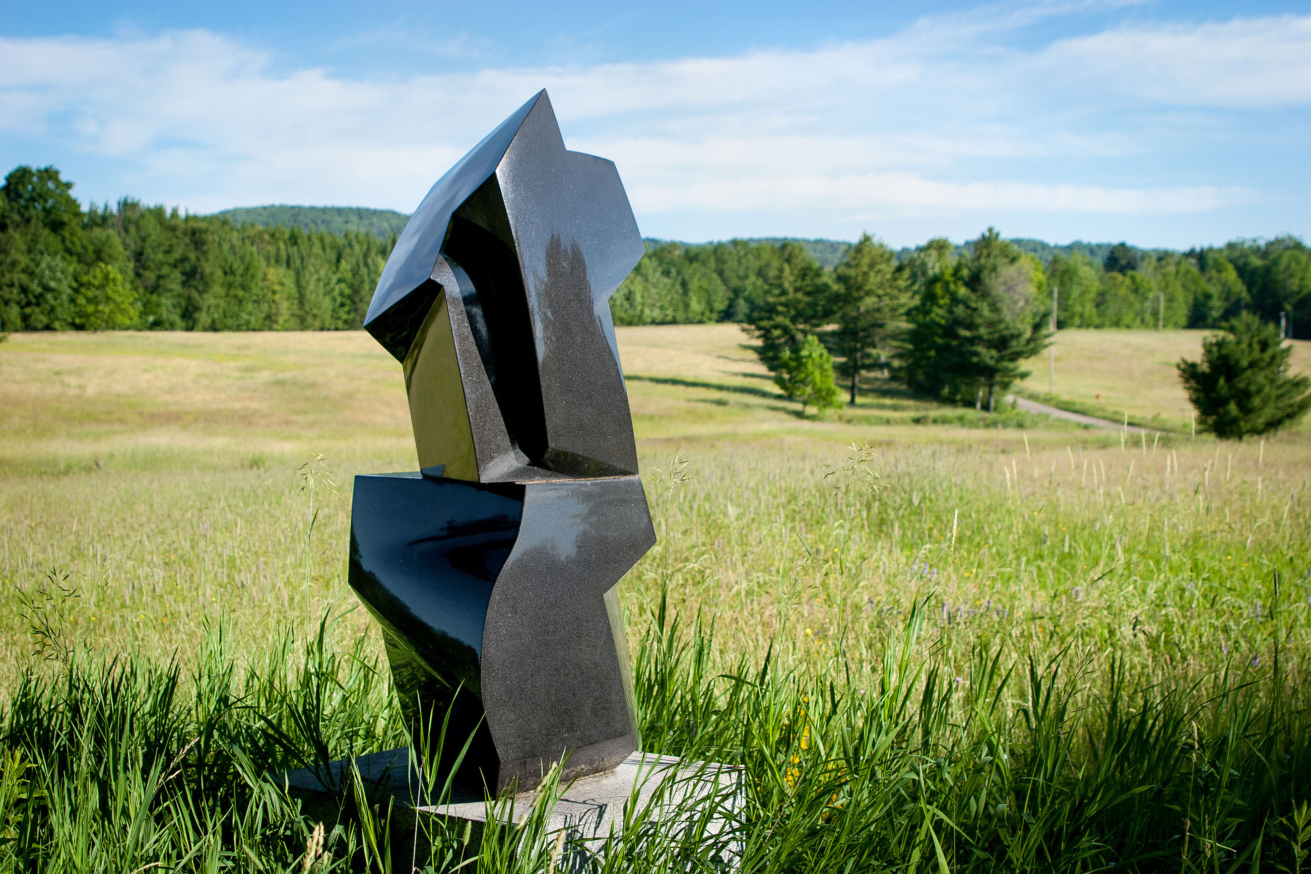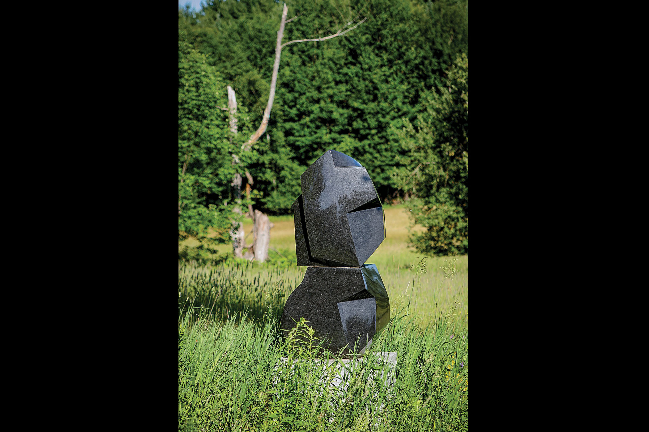 “The juxtaposition with the field is a vital one. The sculpture is a great polished piece of varied and interactive facets in the blackest South African granite. It is strong and delicate, brooding or brilliant, depending on your vantage point and the light and time of day. It is a piece that like the land itself faces a constant meeting with the elements and changes with them, moment by moment, and season by season